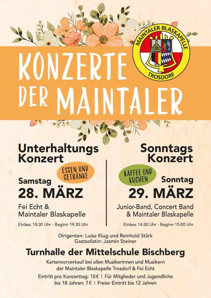 Alle Infos rund um das Konzert findest Du anbei auf dem Plakat. Kartenvorverkauf bei allen Musikerinnen und Musikern der Maintaler Blaskapelle Trosdorf und Fei Echt.